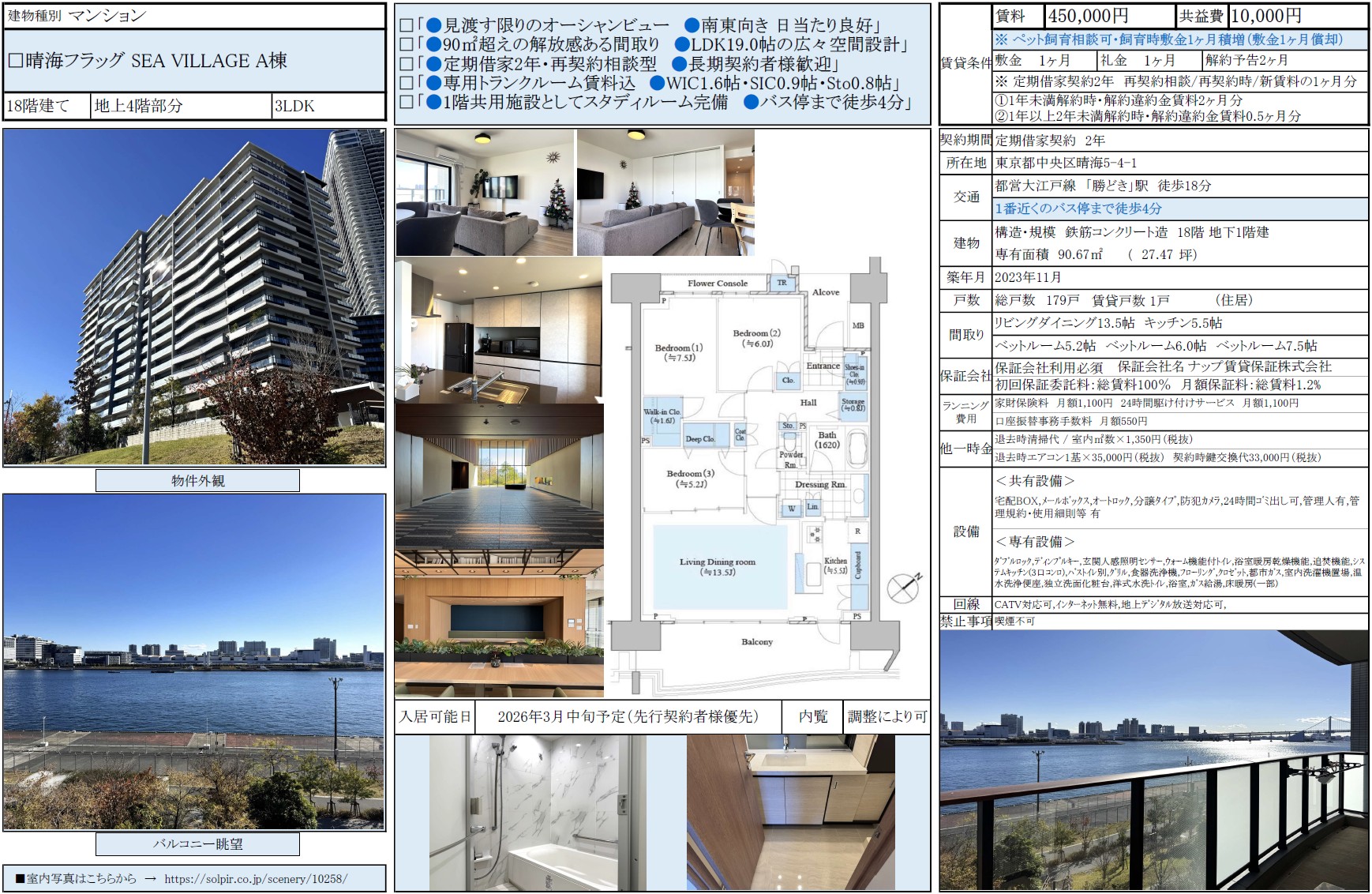 晴海フラッグ SEA VILLAG A棟4階 / 46.0万円 / 3LDK / 90.67㎡ / 賃貸募集中 / 弊社専任媒介