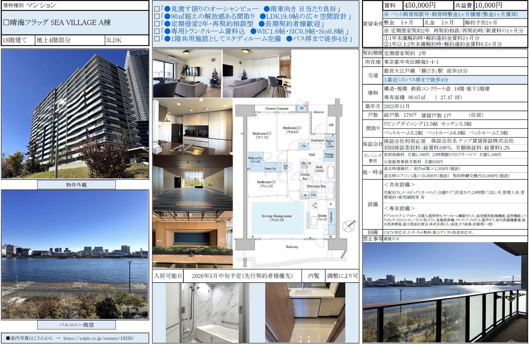 晴海フラッグ SEA VILLAG A棟4階 / 46.0万円 / 3LDK / 90.67㎡ / 賃貸募集中 / 弊社専任媒介