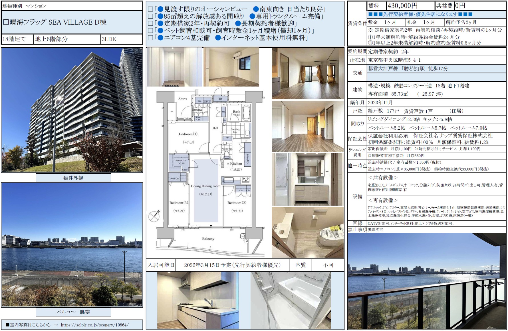 晴海フラッグ SEA VILLAG D棟6階 / 43.0万円 / 3LDK / 85.73㎡ / 賃貸募集中 / 弊社専任媒介