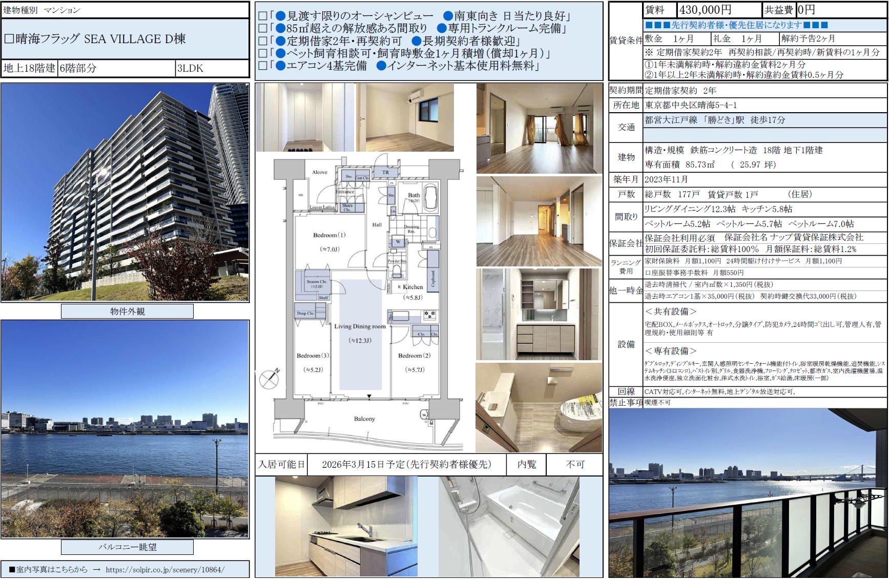 晴海フラッグ SEA VILLAGE D棟6階 / 43.0万円 / 3LDK / 85.73㎡ / 賃貸募集中 / 弊社専任媒介