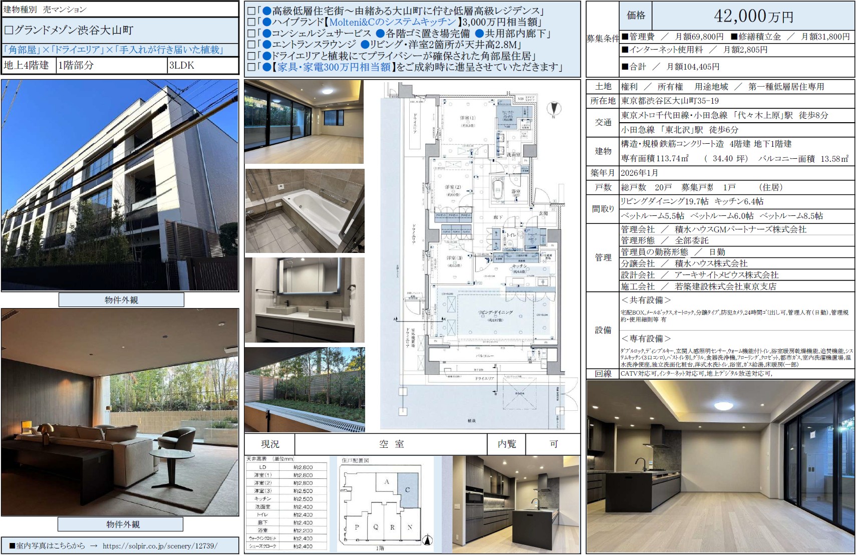 グランドメゾン渋谷大山町1階 / 42,000万円台 / 3LDK / 113.74㎡ / 売買募集中 / 弊社媒介 / 仲介手数料無料