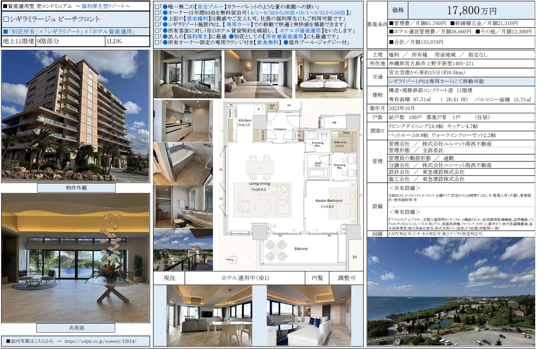 シギラミラージュビーチフロント9階 / 17,800万円 / 1BedRoom / 87.31㎡ / 売却募集中 / 弊社媒介
