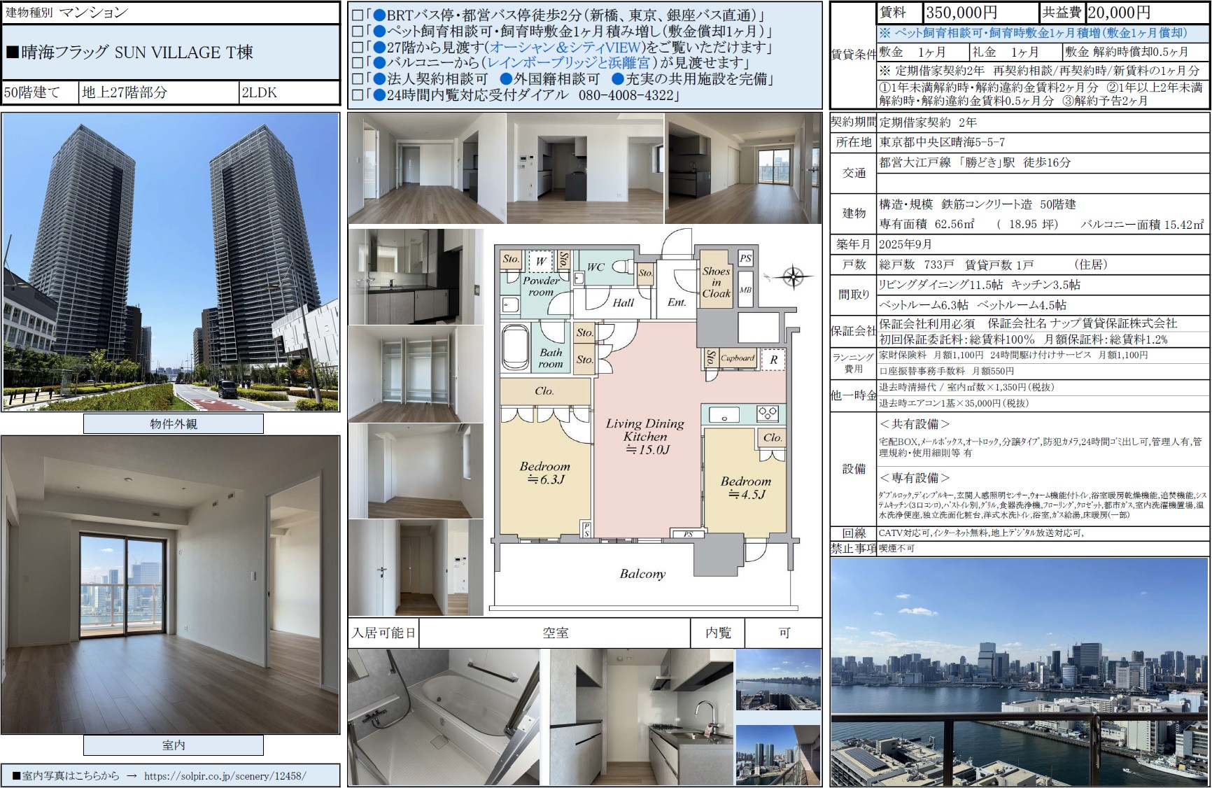 晴海フラッグ SUN VILLAGE T棟27階 / 37.0万円 / 2LDK / 62.56㎡ / 賃貸募集中 / 弊社専任媒介