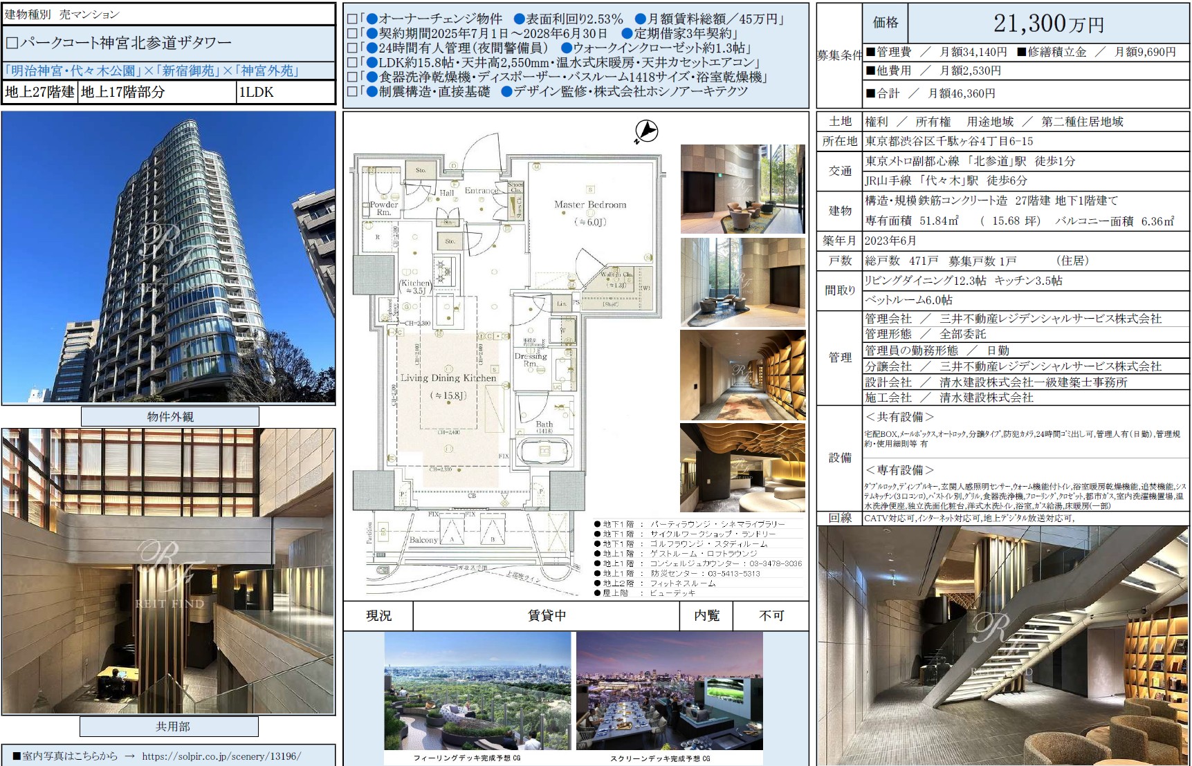 パークコート神宮北参道ザタワー17階 / 21,300万円 / 1LDK / 51.84㎡ / 売却募集中 / 弊社媒介
