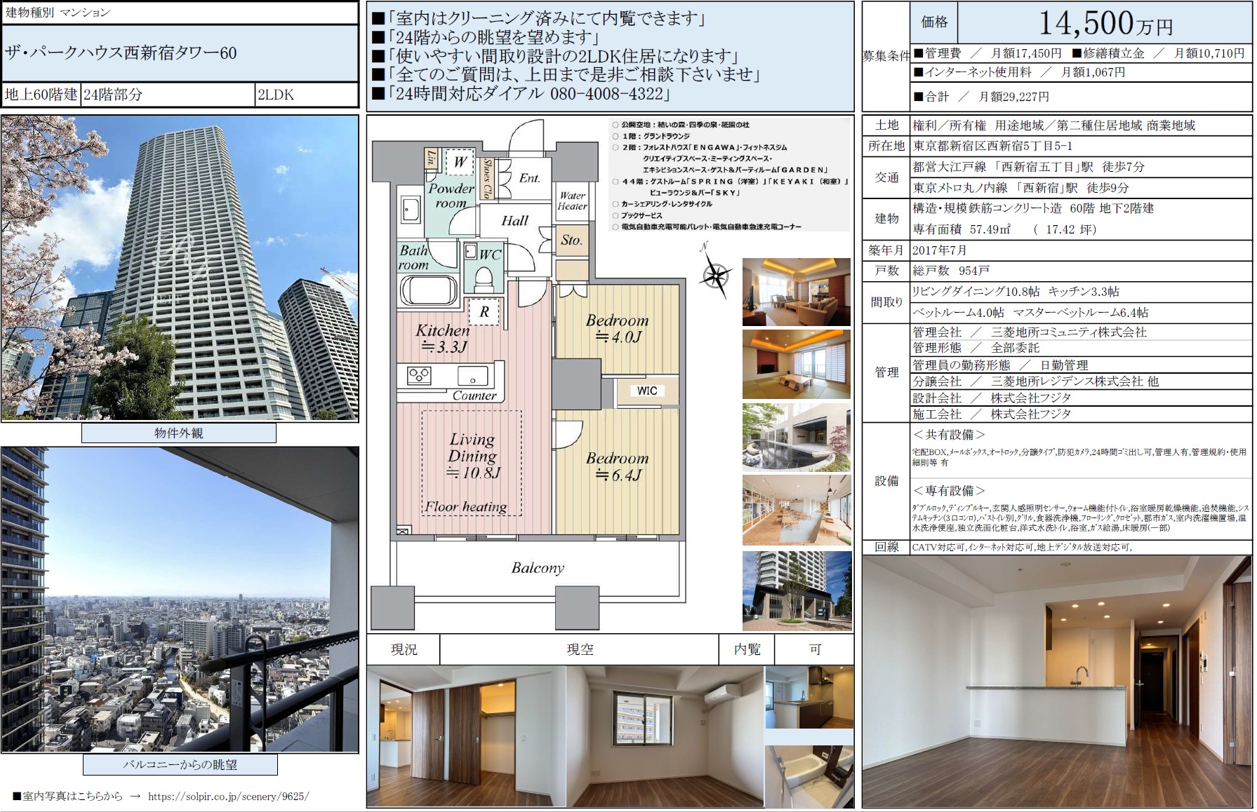 ザ・パークハウス西新宿タワー60 56階 / 14,500万円 / 2LDK / 57.49㎡ / 売却募集中 / 弊社専任媒介